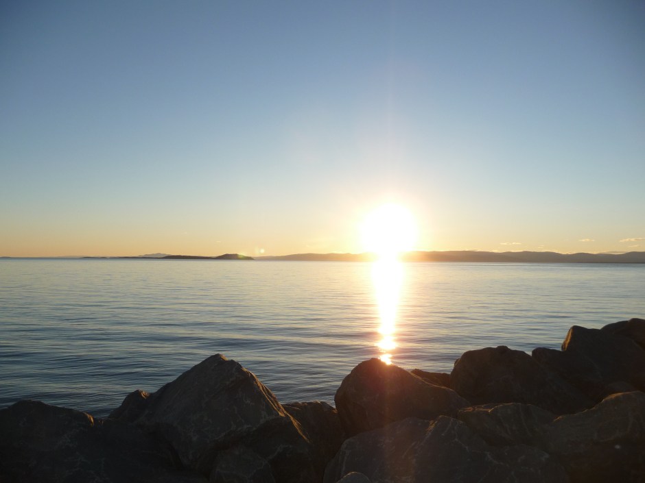 Le jour commençait à tomber, donc j’ai commencé à rentrer. Et là, une étrange mélopée est venue à mes oreilles. Arrivée sur la plage, je les vois les fameuses bananes! Les phoques communs se posent sur les rochers affleurants à l’eau et comme ça ils ressemblent à des bananes. Ils se bagarrent tous pour avoir le meilleur rocher. Concrètement, les critères doivent être différents selon les individus parce qu’ils y en a qui se disputaient le rocher où tu es à moitié dans l’eau. C’est plutôt bon enfant comme ambiance, ils se crient dessus et agitent leurs nageoires mais il n’y a pas de combat. L’un d’eux avait vraiment une drôle de voix, j’ai bien rigolé. Le coucher de soleil en était encore plus beau avec eux.